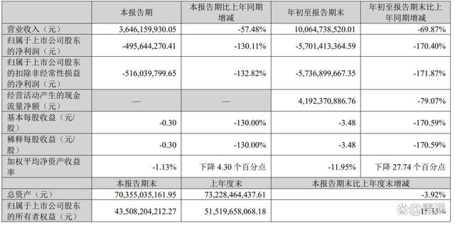 天齐锂业2024年第三季度营收为36.46亿元,同比下降57.48%;净亏损为4.96亿元,扣非后净亏损为5.16亿元。