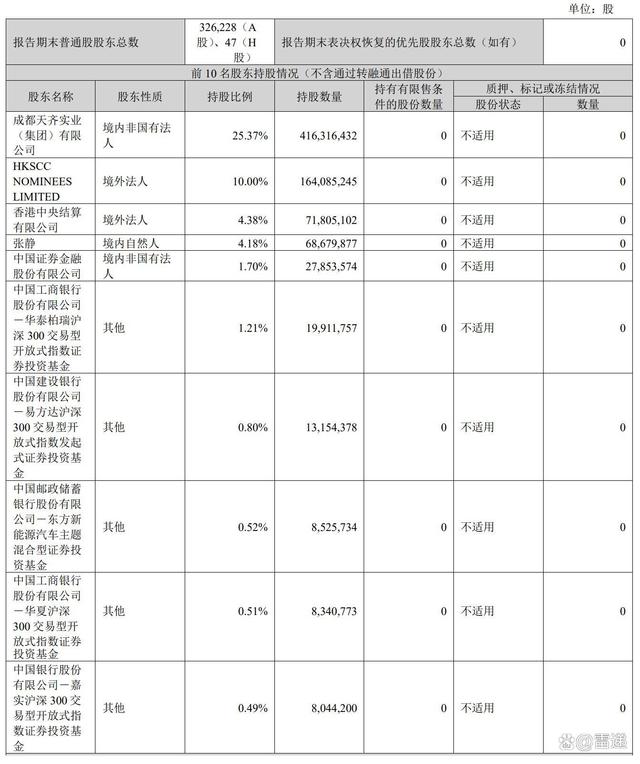 截至2024年9月30日,成都天齐实业(集团)有限公司持股25.37%,HKSCCNOMINEESLIMITED持股10%,香港中央结算有限公司持股为4.38%,张静持股为4.18%,中国证券金融股份有限公司持股为1.7%,中国工商银行股份有限公司-华泰柏瑞沪深300 交易型开放式指数证券投资基金持股为1.21%,中国建设银行股份有限公司-易方达沪深 300交易型开放式指数发起式证券投资基金持股为0.8%;