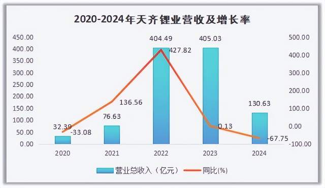 根据公司报告,天齐锂业去年营收为130.63亿元,同比下降67.75%。2022年和2023年,是天齐锂业的巅峰时期,当时的营收分别为404.49亿元、405.03亿元,转眼间已不复当年景象。