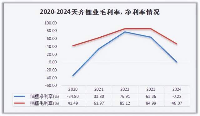 碳酸锂产品价格下降,也拖累了天齐锂业的整体利润率表现。根据财报数据,天齐锂业整体毛利率已从2022年的85.12%下降至2024年的46.07%;净利率从2022年的76.91%下降至2024年的-0.22,跌至冰点。