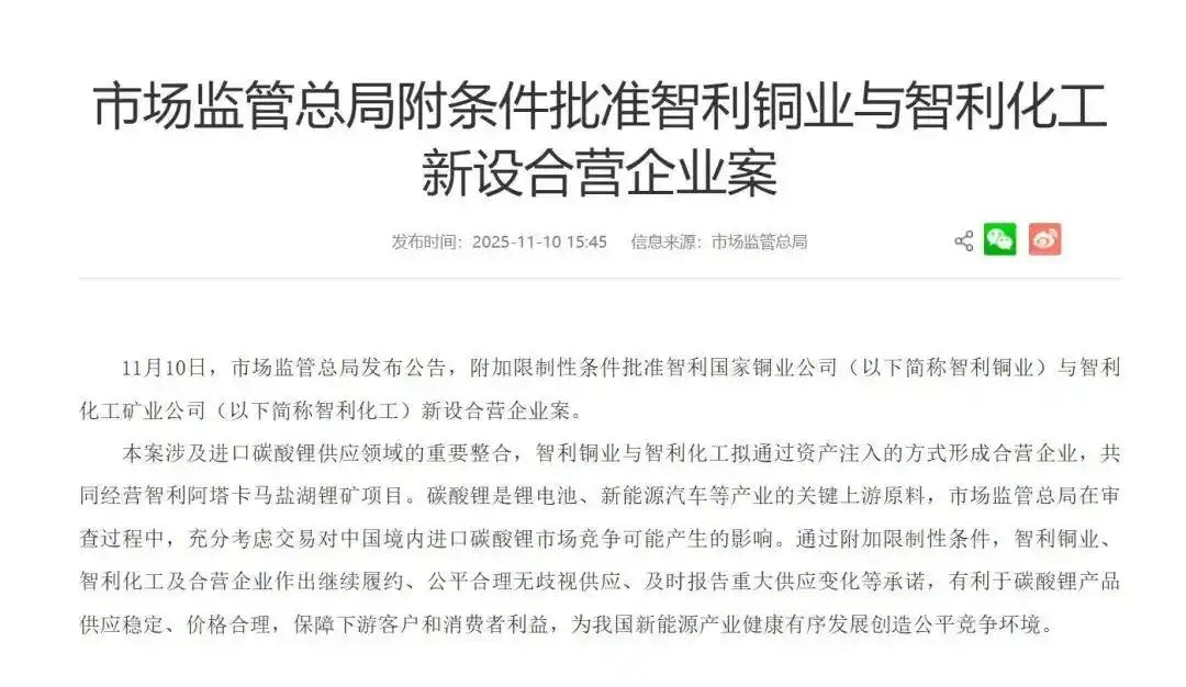 公告内容显示,智利铜业与智利化工拟通过资产注入的方式形成合营企业,共同经营阿塔卡马盐湖锂矿项目。碳酸锂是锂电池、新能源汽车等产业的关键上游原料,市场监管总局在审查过程中,充分考虑交易对中国境内进口碳酸锂市场竞争可能产生的影响。通过附加限制性条件,智利铜业、智利化工及合营企业作出继续履约、公平合理无歧视供应、及时报告重大供应变化等承诺,有利于碳酸锂产品供应稳定、价格合理,保障下游客户和消费者利益,为我国新能源产业健康有序发展创造公平竞争环境。