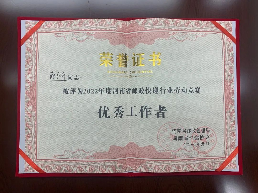 河南省公司总经理郑红升被评为“2022年度河南省邮政快递行业劳动竞赛优秀工作者”。