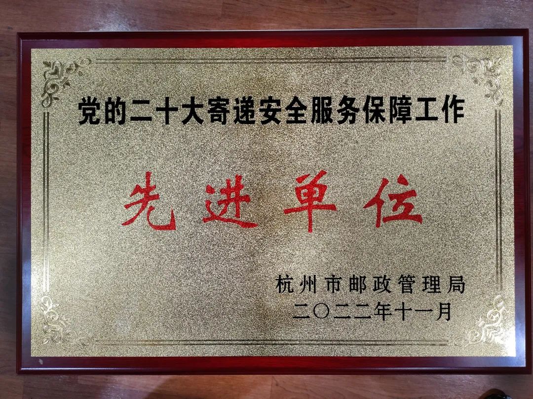浙江省公司、杭州申通云仓快递有限公司荣获杭州市邮政快递业党的二十大寄递安全服务保障先进单位,杭州转运中心朱世祥、王俊杰先荣获先进个人。