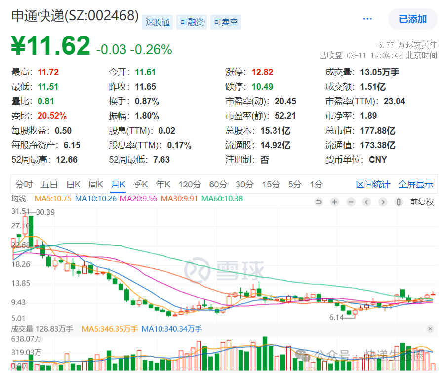 年初至今,申通快递股价上涨15%,公司最新市值178亿。