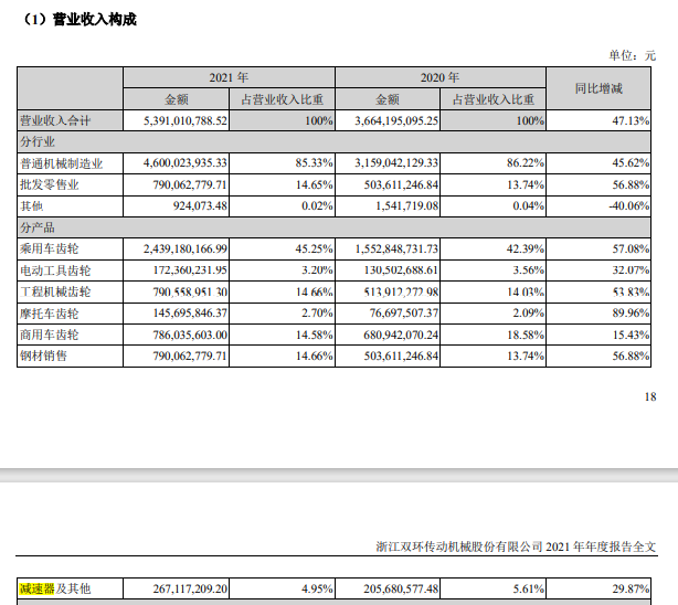 双环传动4月26日发布2021年年度报告,年报显示,2021年双环传动实现营业总收入539101.08万元,较上年同期增长47.13%;主营业务收入451773.81万元,较上年同期增长44.73%;归属于上市公司股东的净利润为32632.91万元,较上年同期增长536.98%。