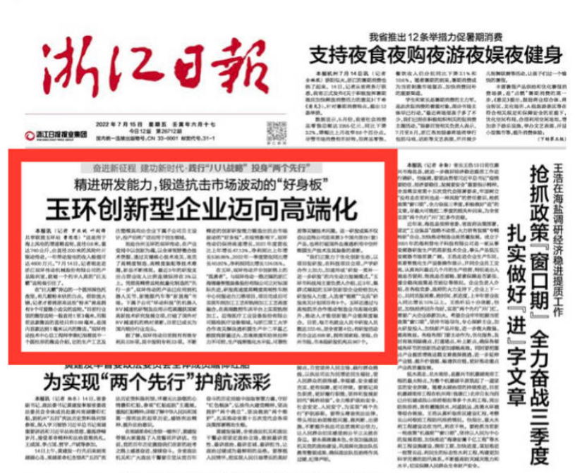 7月15日,《浙江日报》头版头条刊发了题为《精进研发能力,锻造抗击市场波动的“好身板”,玉环创新型企业迈向高端化》文章,用大篇幅报道了双环传动在研发创新领域的生动详实的案例。