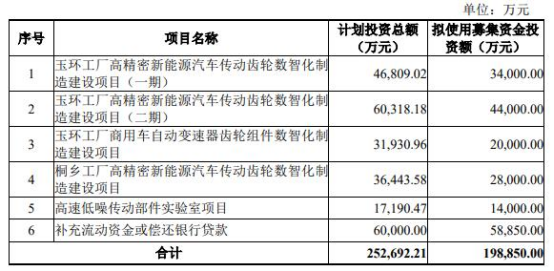 本次非公开发行股票拟募集资金总额(含发行费用)不超过人民币19.89亿亿元(含本数),本次发行的股票数量按照本次发行募集资金总额除以发行价格计算,且不超过本次发行前公司总股本的15%,即不超过1.17亿股(含本数),扣除发行费用后的募集资金净额将分别用于玉环工厂高精密新能源汽车传动齿轮数智化制造建设项目(一期)、玉环工厂高精密新能源汽车传动齿轮数智化制造建设项目(二期)、玉环工厂商用车自动变速器齿轮组件数智化制造建设项目、桐乡工厂高精密新能源汽车传动齿轮数智化制造建设项目、高速低噪传动部件实验室项目、补充流动资金或偿还银行贷款。