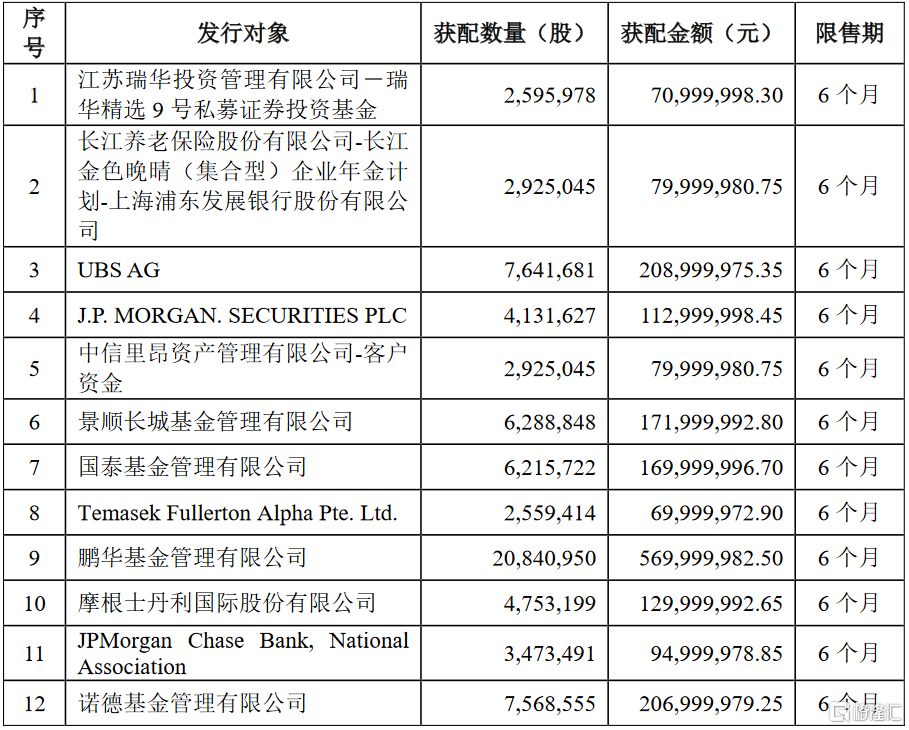 格隆汇10月18日丨双环传动(002472.SZ)发布非公开发行股票发行情况报告书,确定此次发行价为27.35元/股,发行数量为7270.5667万股,募集资金总额约19.88亿元。此次发行最终确定发行对象为13名,最终配售结果如下: