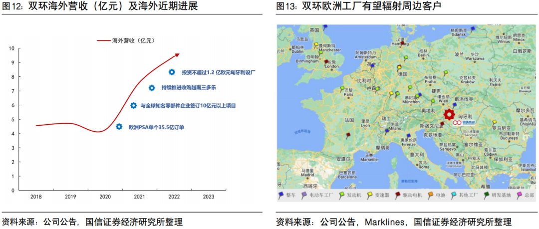 步步为营,全球化战略持续推进,产品、技术、产能出口,海外订单持续突破。随海外新能源汽车渗透率快速提升,叠加产业变革带来的齿轮外包趋势深化,市场对高速低噪的高精密齿轮及其相关零部件需求将持续释放,我们测算2025年全球新能源车端传动齿轮市场空间约300亿元,且后续随新能源汽车持续放量及双电机车型的持续渗透,市场需求有望持续增长。双环2022年海外营收9.4亿元,同比+24%,海外销售毛利率19.9%,同比+3.2pct,公司积极制定全球化战略框架,在技术、人才、产能、客户皆有深度布局,有望获得中长期持续增长的动力: