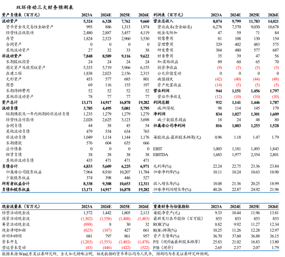 随着乘用车电动化率的持续提升,汽车齿轮市场格局重塑,齿轮外包趋势愈发明确。双环作为电驱齿轮龙头,在技术研发、设备产能和客户资源上均有着明显的竞争优势,后续将持续受益于行业电动化率的提升。减速器方面,减速器是工业机器人的核心部件,价值量占比大,双环深耕工业机器人精密减速器多年,已逐步实现6-1000KG工业机器人所需精密减速器的全覆盖,并已配套国内一线机器人客户,后续减速业务收入将持续增长。民生齿轮方面,公司成立环驱科技布局民生齿轮,并收购三多乐,助力民生齿轮业务发展,三多乐主要产品包括精密齿轮、塑胶齿轮减速器、汽车零配件和机能组装品,并覆盖下游广泛优质客户。