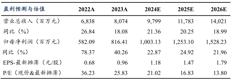 我们维持公司2024-2026年归母净利润为10.03亿元、12.53亿元、15.28亿元的预测,对应的EPS分别为1.18元、1.47元、1.79元,2024-2026年市盈率分别为21.02倍、16.83倍、13.80倍,维持“买入”评级。