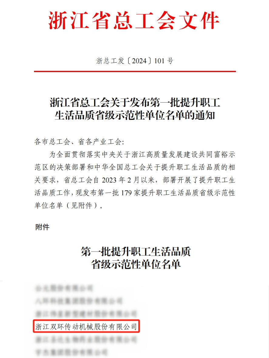 近日,浙江省总工会发布了第一批提升职工生活品质省级示范性单位名单,双环传动荣登榜单。