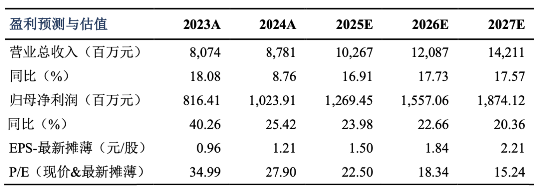 我们基本维持公司2025-2026年归母净利润为12.69亿元、15.57亿元的预测(前值为12.66亿元、15.46亿元),新增2027年归母净利润预测值18.74亿元,对应的EPS分别为1.50元、1.84元、2.21元,2025-2027年市盈率分别为22.50倍、18.34倍、15.24倍,维持“买入”评级。