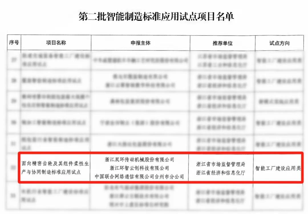 近日,国家标准化管理委员会与工业和信息化部联合发布了《第二批智能制造标准应用试点项目名单》,双环传动及其子公司环智云创联合中国联通台州分公司申报的项目《面向精密齿轮及其组件柔性生产与协同制造标准应用试点》成功上榜。这标志着双环及其子公司环智云创在智能制造领域的创新能力与技术实力获得高度认可。