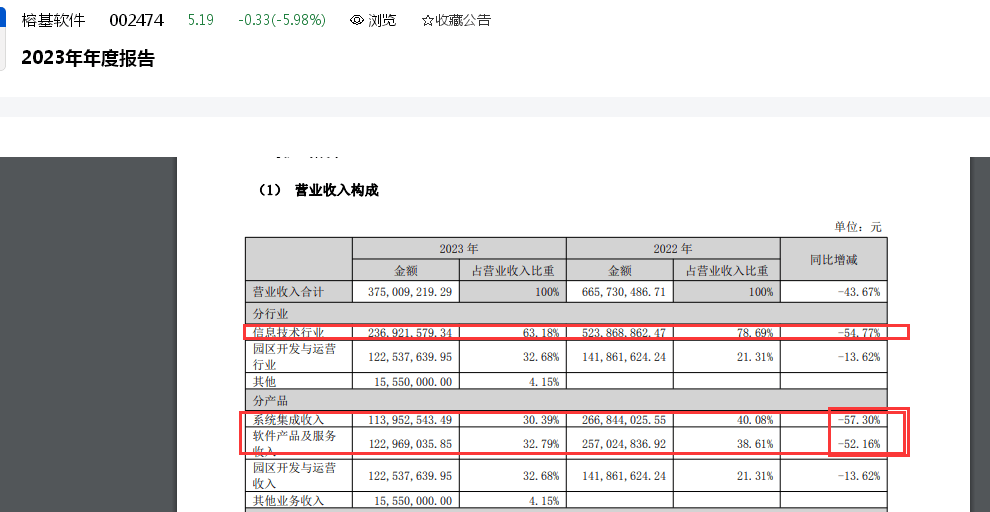 不过,2023年,作为贡献六成营收的核心业务即系统集成收入、软件产品及服务收入合计仅录得2.36亿元,同比下滑54.77%。另外,作为贡献三成营收的园区开发与运营收入同比亦下滑,即下滑13.62%。