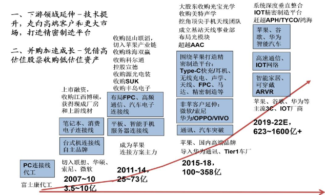 立讯精密在2010-2011年连续收购江西博硕、联滔电子成功切入苹果、联想、华硕、微软等国际知名品牌商供应链,其中苹果是主攻对象,并在2014年逐渐成长为苹果连接方案主力供应商,2015年切入手表无线充电领域。
