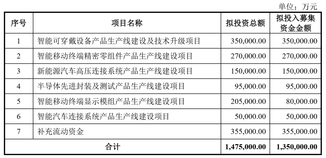 仅仅10天后的2月21日晚间,立讯精密的第二个大动作来了:一份规模高达135亿元的再融资计划,涉及可穿戴设备、移动终端、半导体封测、显示模组等六个方面。