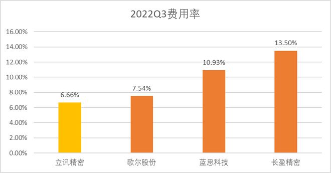 再从费用率的角度来看,以三季度三费占营收比重横向来看,立讯精密是同业中费用率最低的企业,在创造等量价值的前提下,立讯的管理费用花费更少,确实可以看出立讯在管理能力层面领先同业对手。