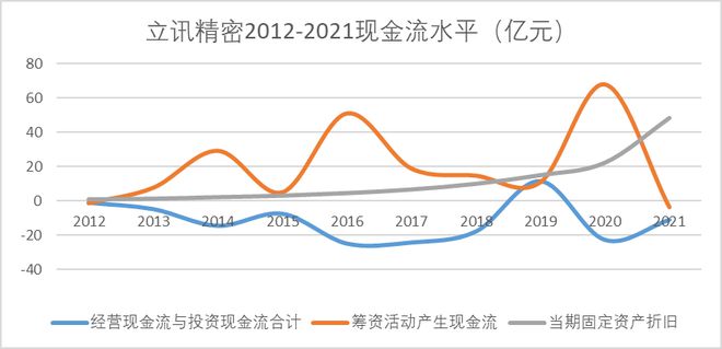 图:立讯2012-2021现金流水平,来源:Choice金融客户端