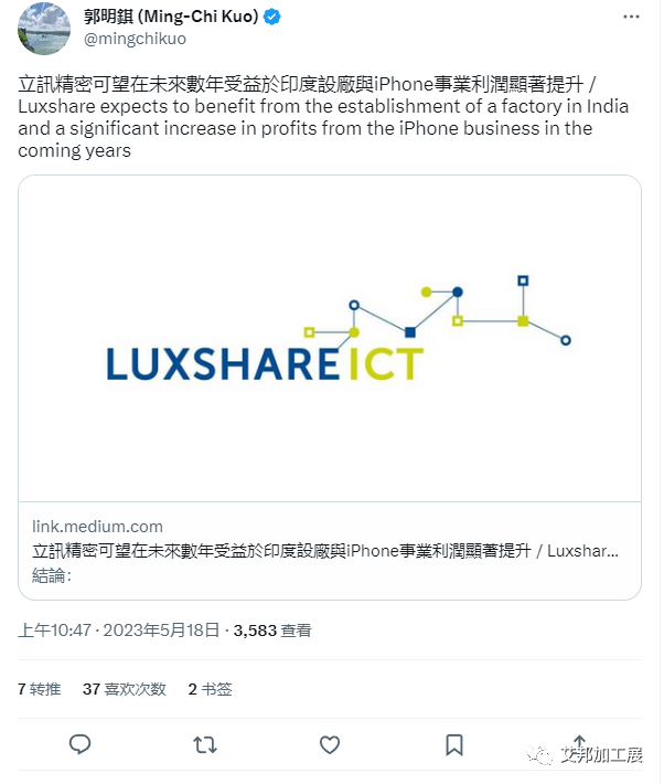 5 月 18 日消息,知名苹果分析师郭明錤预期苹果将协助立讯精密在印度设立产线,立讯精密有望在未来数年内受益于印度市场与供应链的成长。