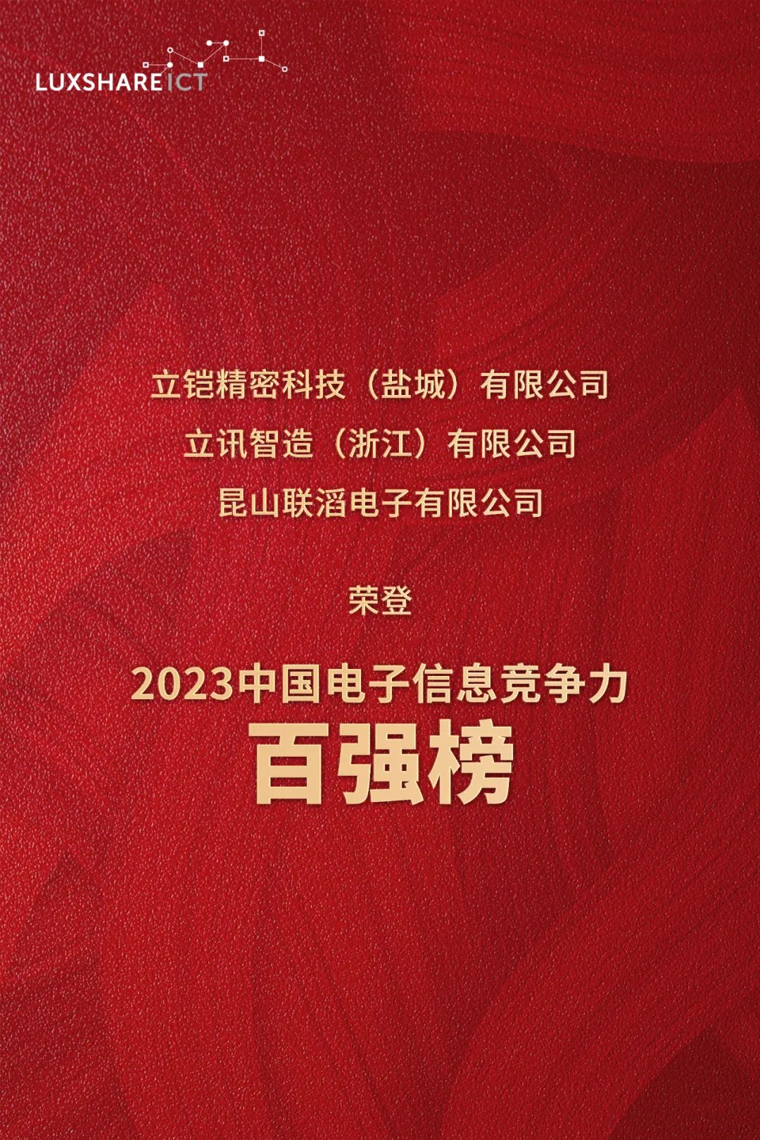 9月9日,2023年度电子信息企业竞争力报告及前百家企业发布会在厦门举行。立讯精密旗下的立铠精密科技(盐城)有限公司、立讯智造(浙江)有限公司、昆山联滔电子有限公司等3家企业荣登2023中国电子信息竞争力百强榜。