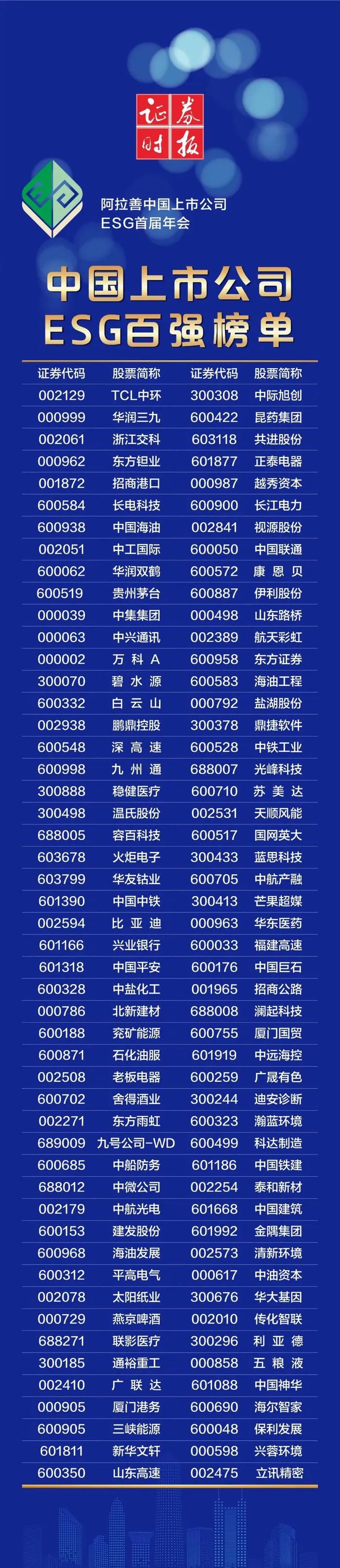 ESG百强是由证券时报旗下智库中国资本市场研究院自主研发,秉承科学、客观、公正的原则,从环境(E)、社会(S)、公司治理(G)三个维度出发,设置16个二级指标、47个三级指标及100多个四级指标,采用专业的量化评分体系,对上市公司的ESG表现进行综合评估,最终确定ESG百强入选公司。