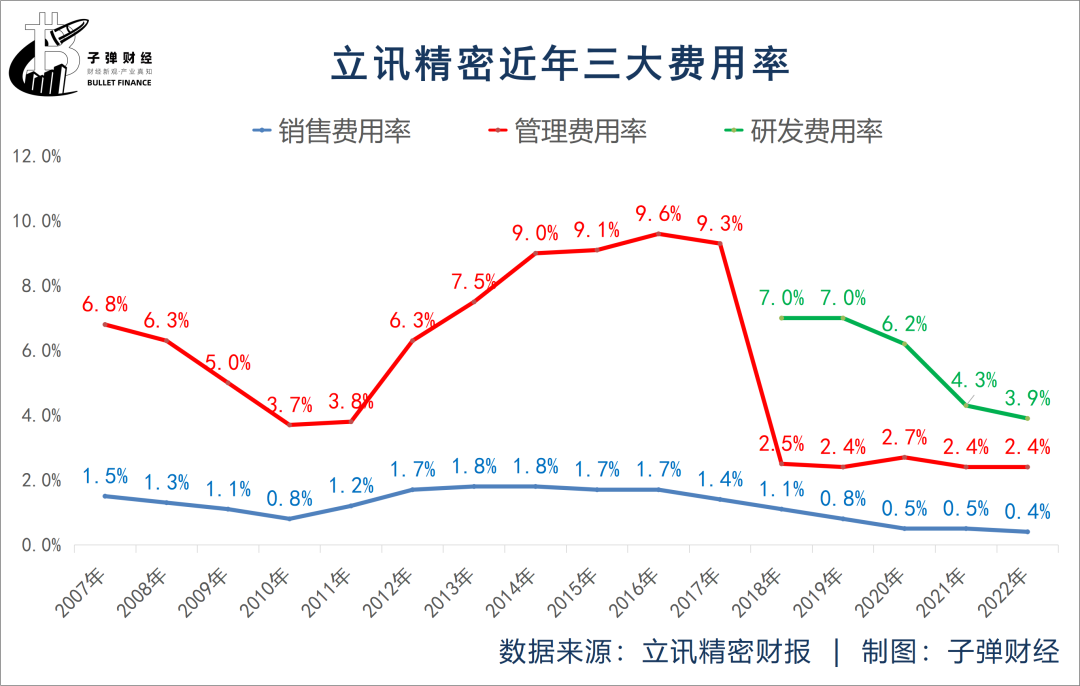 同样身为科技企业的立讯精密,过去几年研发费用率不仅没有上升,反而大幅下降。从财务角度而言,降低研发费用率使得立讯精密仍能维持不错的利润增长。