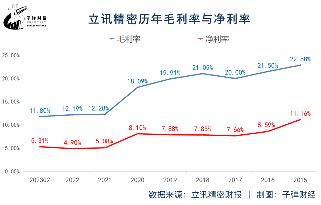 2015年,立讯精密毛利率高达22.88%,净利率11.16%,此后几年毛利率和净利率双双下滑,截至2023年前三季度,公司毛利率只有11.80%,净利率也下滑至5.31%,这两项数值都仅是2015年的一半左右。