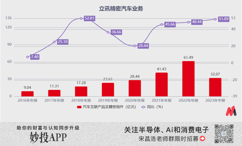 除了MR产品,汽车业务被立讯寄予厚望,也是目前立讯增长最快的业务,但是中短期来看,能给立讯整体的业绩提升也十分有限。