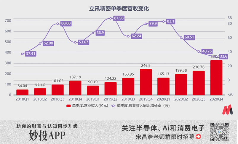 根据公司单季度营收数据显示,从2018年Q2开始,立讯的单季度营收增速明显提速,从单季度不到40%的增速开始稳定的保持在了60%以上的增速。