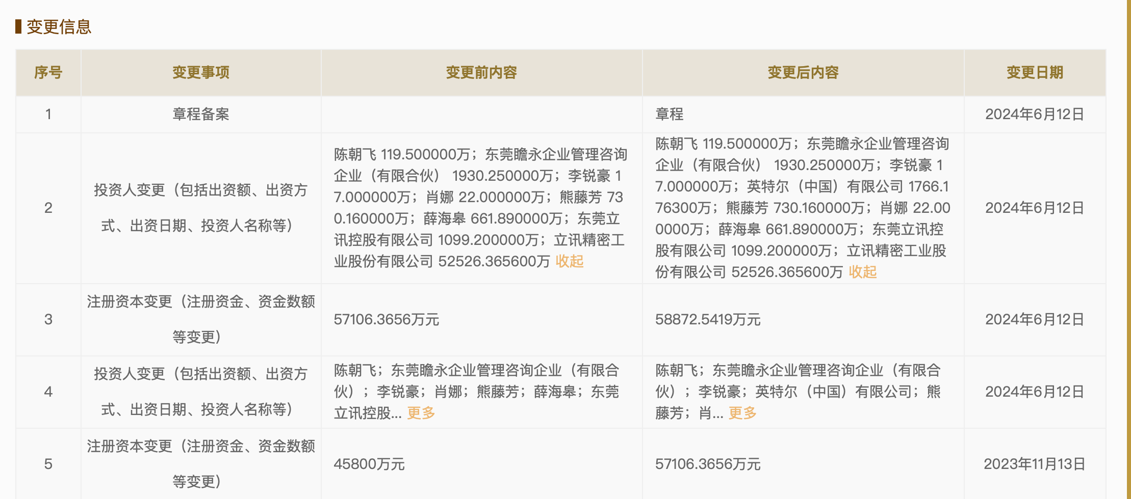 6月18日,据国家企业信用信息公示系统显示,立讯精密旗下的子公司东莞立讯技术有限公司(东莞立讯技术)最新的股东名单中出现了英特尔(中国)有限公司,出资额1766万元,同时,注册资本由约5.71亿元人民币增至约5.89亿元人民币。
