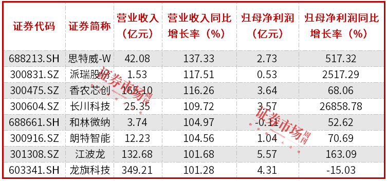 在营收增长翻倍的8家公司中,除龙旗科技外,思特威-W、派瑞股份、香农芯创、长川科技、和林微纳、朗特智能、江波龙全部实现业绩增长。其中,思特威-W、江波龙实现业绩翻倍,长川科技、派瑞股份实现了业绩翻十倍。