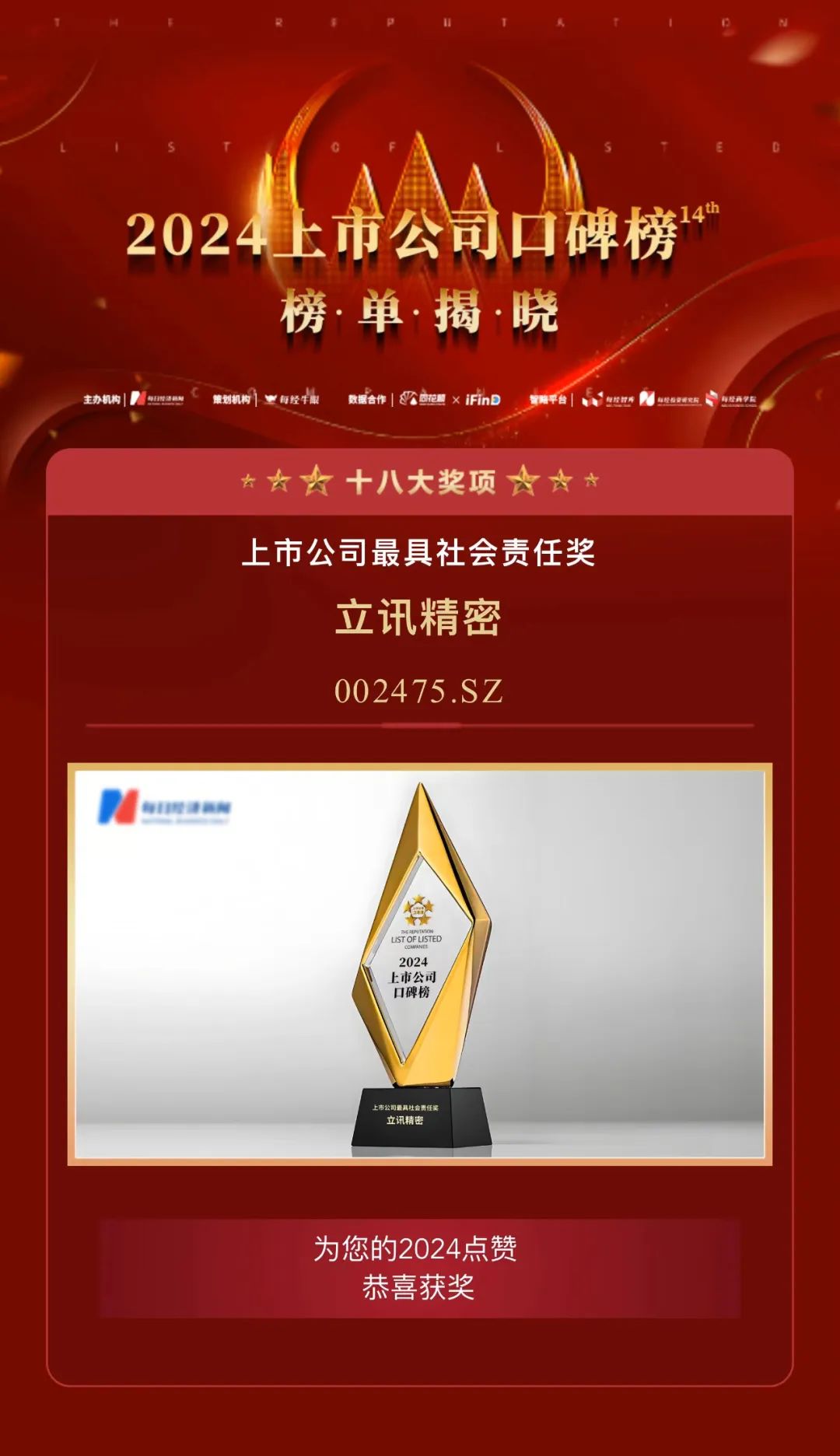 12月6日,每日经济新闻隆重揭榜“2024第十四届中国上市公司口碑榜”。立讯精密成功入围榜单并获“上市公司20年非凡跨越奖”和“上市公司最具社会责任奖”两大权威奖项。