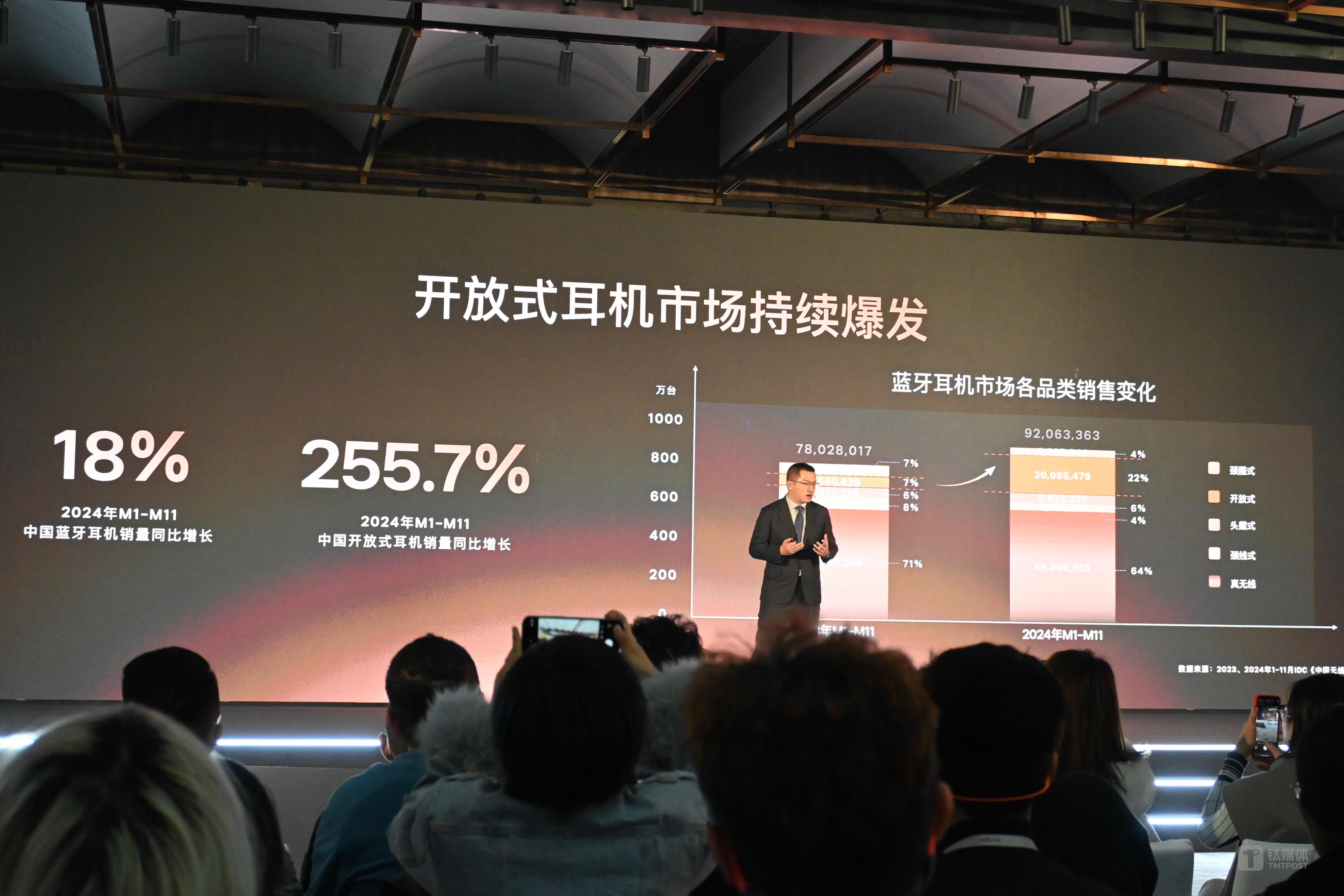 Shokz韶音中国区CEO杨云分享了品牌在销量、技术专利方面的最新情况。IDC数据显示,2024年前11个月,在骨传导耳机市场,销售量和销售额前三均为韶音的产品。从总体上看,韶音在骨传导耳机市场销售额占比近6成,截至2024年12月,韶音在全球范围内已布局超过3500项声学专利,开放式耳机发明专利数超1900件。