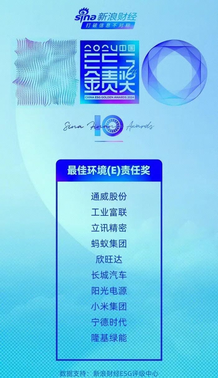 1月16日,由新浪财经主办的2024企业ESG“金责奖”评选结果正式公布。经ESG权威评级数据库评分、公众投票及专家评审委员会严格审核,立讯精密荣获2024企业ESG“金责奖”——最佳环境(E)责任奖。