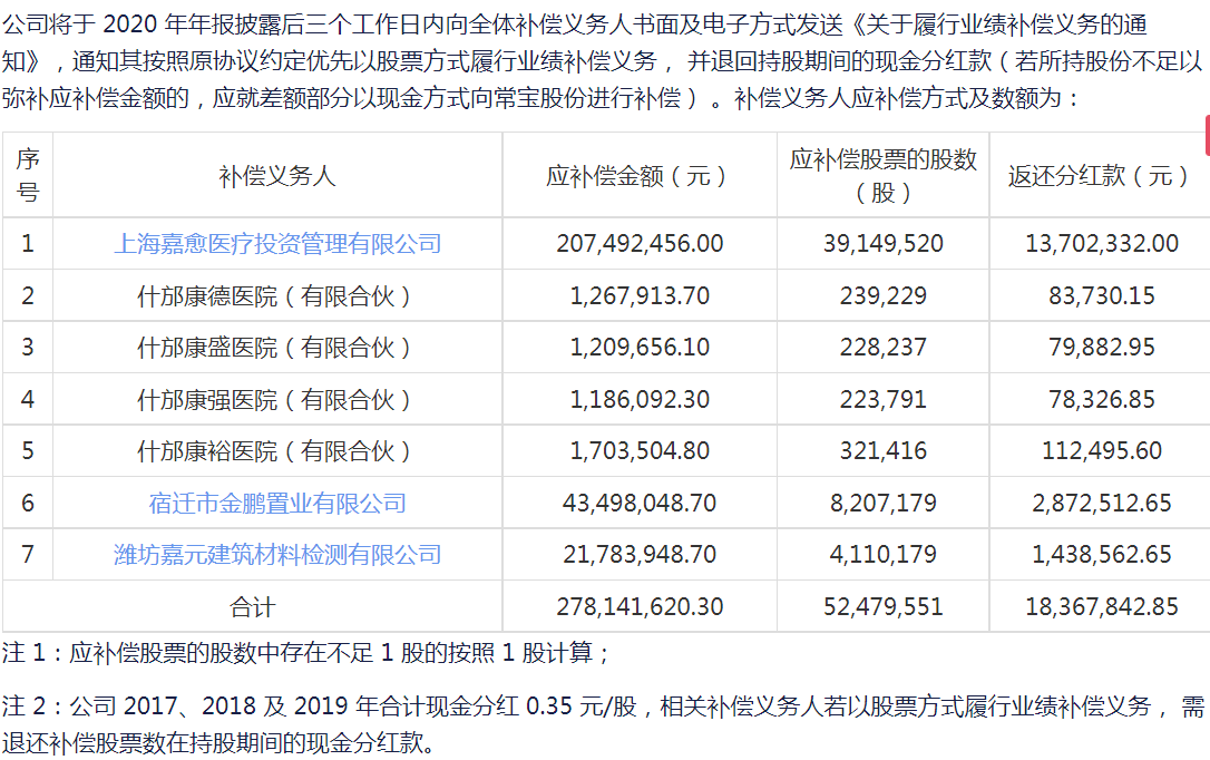 在11月5日公告中,常宝股份称于今年5月18日先行完成了嘉愈医疗、什邡康德、什邡康盛、什邡康强、什邡康裕等5个补偿义务人合计4016.22万股的回购注销,占回购前公司总股本4.18%。目前上述5个补偿义务人完成全部的业绩补偿义务(含分红款退还)。