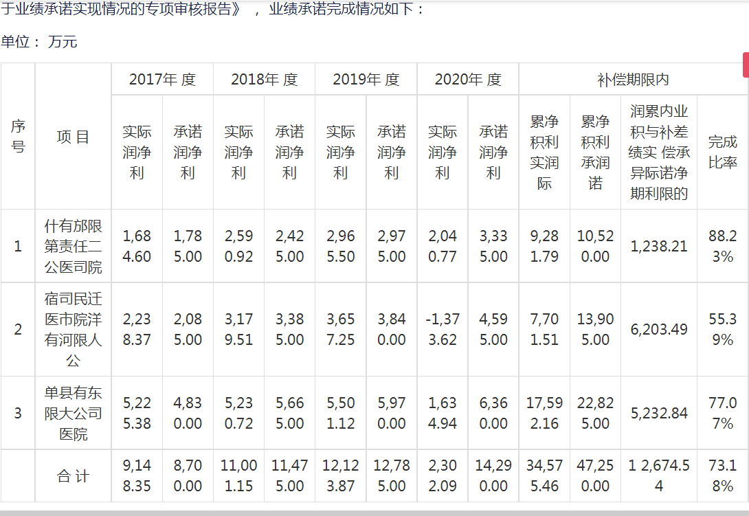 单县东大医院有限公司补偿义务人嘉愈医疗、潍坊嘉元承诺,单县东大医院有限公司2017~2020年度的净利润分别不低于4830万元、5665万元、5970万元及6360万元。