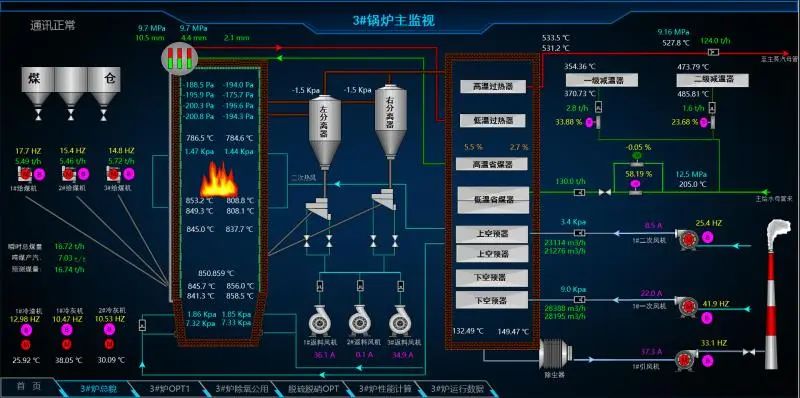 搭建重要参数展板与智能报表系统,实时采集主汽压力、炉膛负压、NOx排放等关键指标,生成分钟级趋势曲线与自动化报表。通过数据可视化呈现和参数偏离阈值预警,辅助运行人员快速定位异常。
