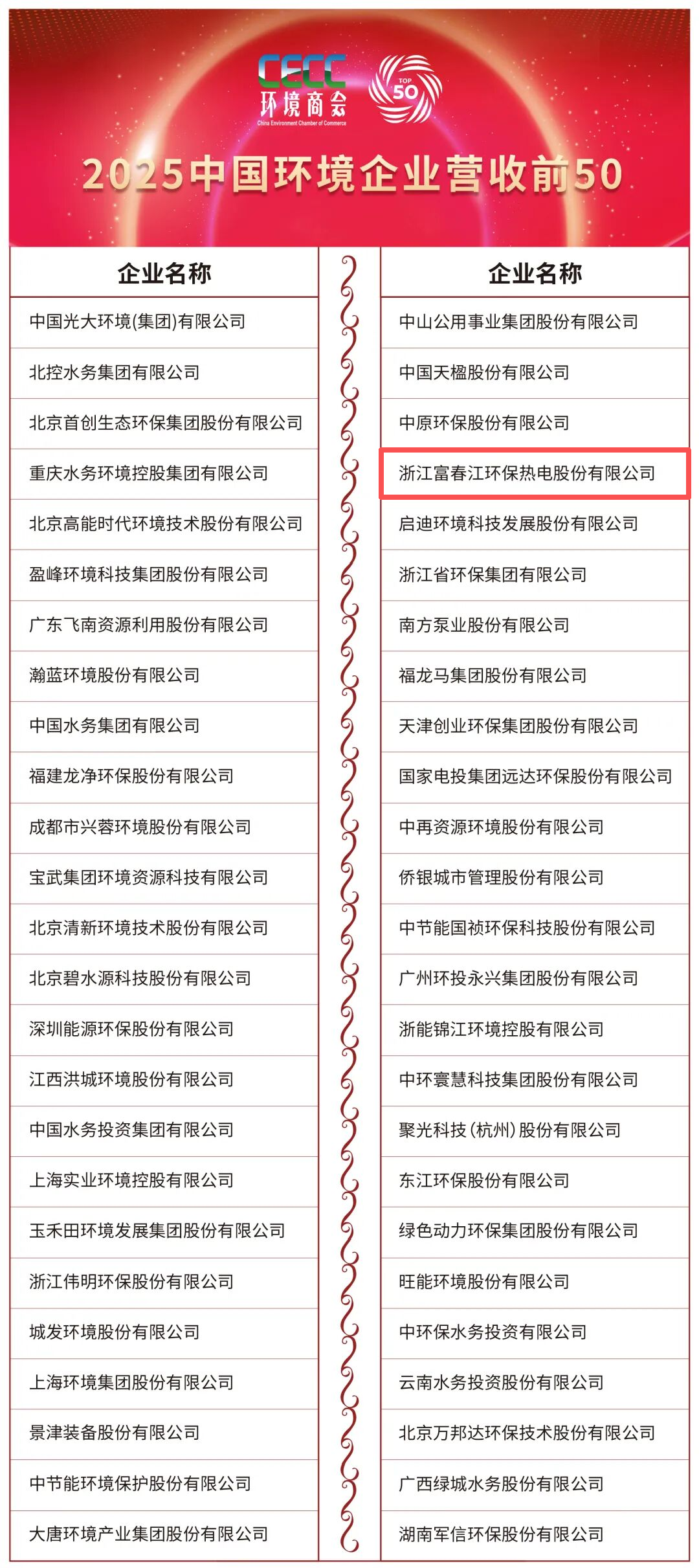 近日,全联环境服务业商会2025年会、2025中国生态环境产业发展大会暨环境上市公司论坛在北京隆重召开。会上,环境商会秘书长马辉正式发布了《2025中国环境企业营收前50发展报告及名录》。凭借稳健的营收表现、领先的技术实力以及深厚的行业积淀,浙江富春江环保热电股份有限公司成功入围“2025中国环境企业营收前50名录”。