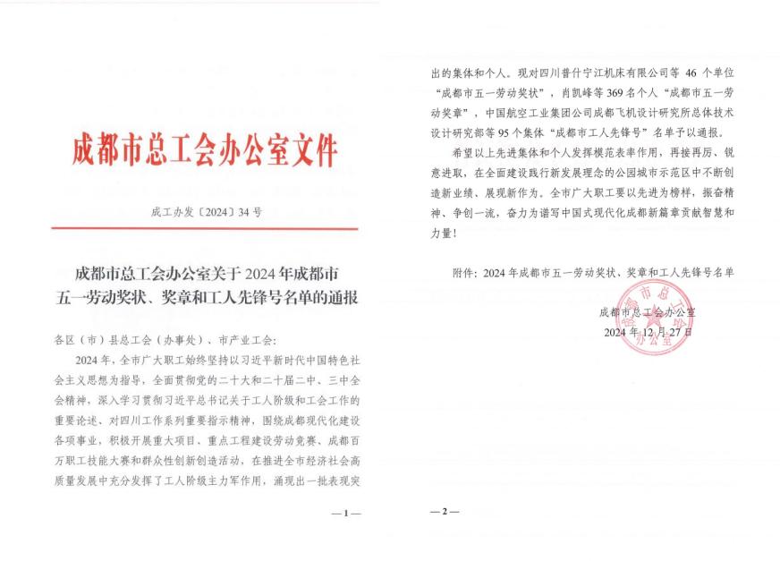 近日,成都市总工会办公室印发《关于2024年成都市五一劳动奖章、奖章和工人先锋号名单的通报》,成都市新筑路桥机械股份有限公司荣获“成都市五一劳动奖状”。