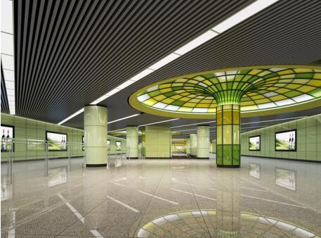 人民广场站位于友谊路经纬街交口,临江设置,周边皆为欧式建筑。在设计上,现代时尚与古典端庄的融合,带入欧式教堂的彩绘玻璃与穹顶元素,车站中每一处的设置,犹如广场中独立的景观,在其灯光的衬托下显得格外瞩目。