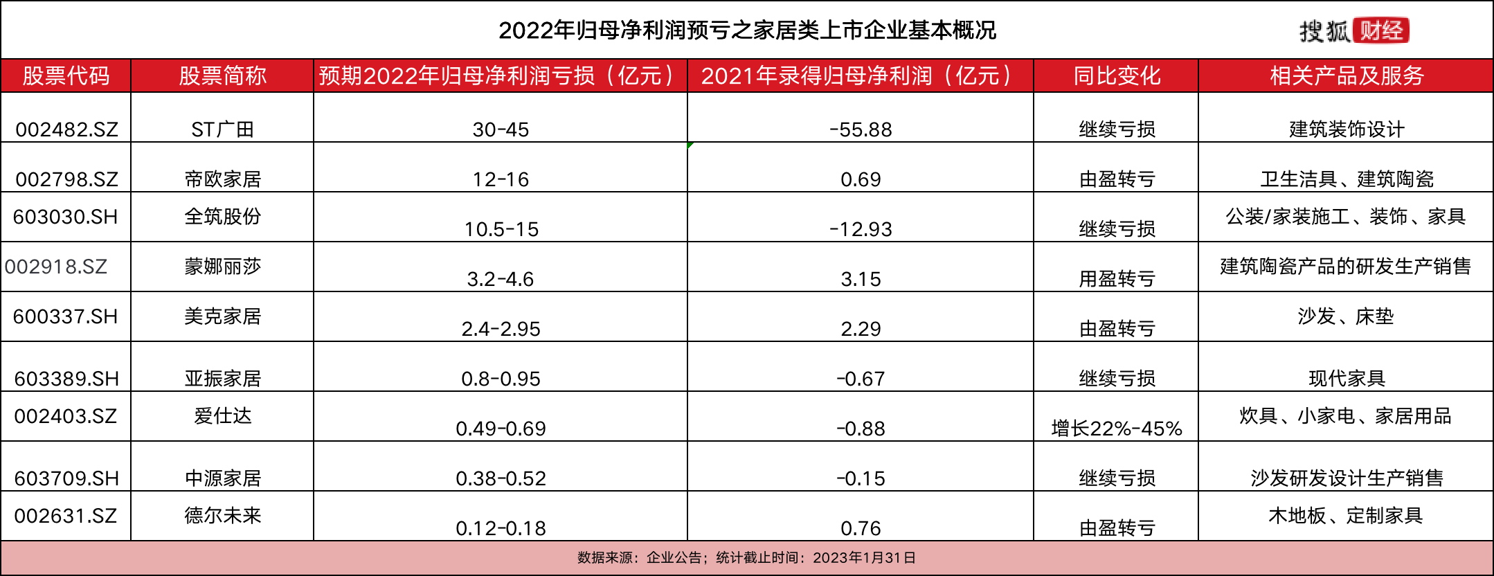 2022年归母净利润预亏之家居类上市企业基本概况,制表:搜狐财经
