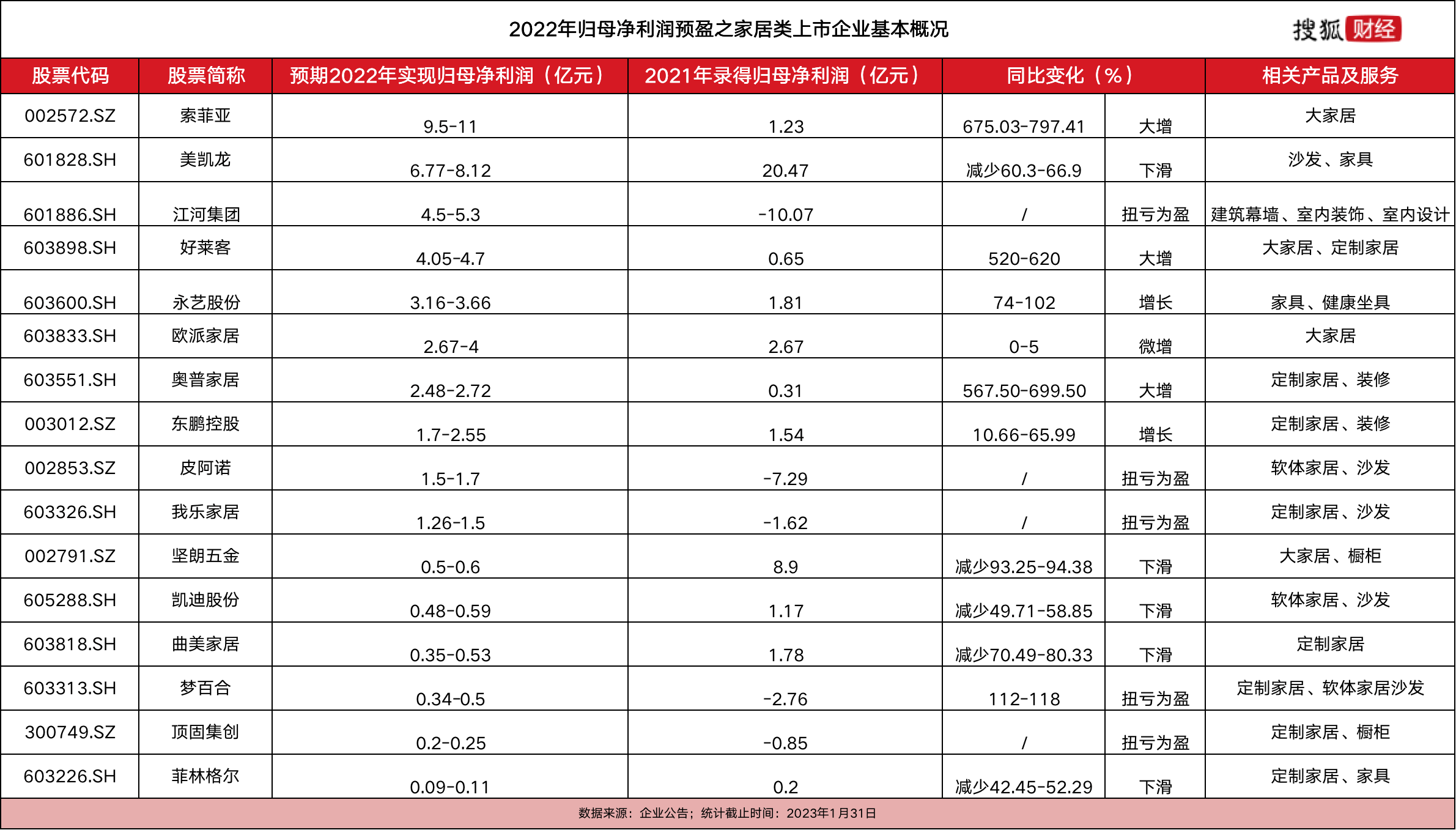 2022年归母净利润预盈之家居类上市企业基本概况,制表:搜狐财经
