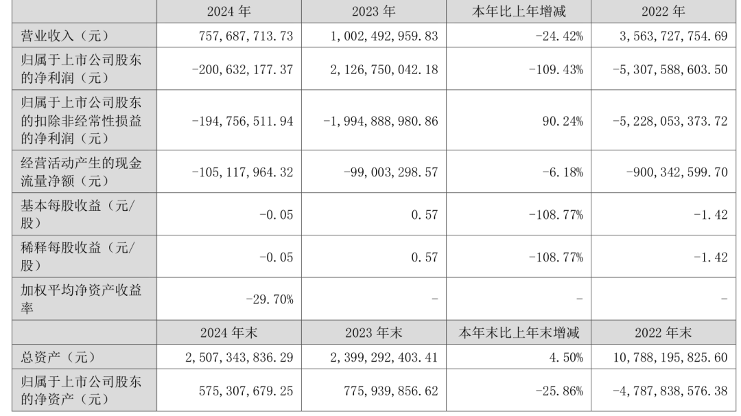2024年,公司实现营业总收入7.58亿元,同比下降24.42%;归母净利润亏损2.01亿元,上年同期盈利21.27亿元;扣非净利润亏损1.95亿元,上年同期亏损19.95亿元;经营活动产生的现金流量净额为-1.05亿元,上年同期为-9900.33万元;报告期内,广田集团基本每股收益为-0.05元,加权平均净资产收益率为-29.70%。