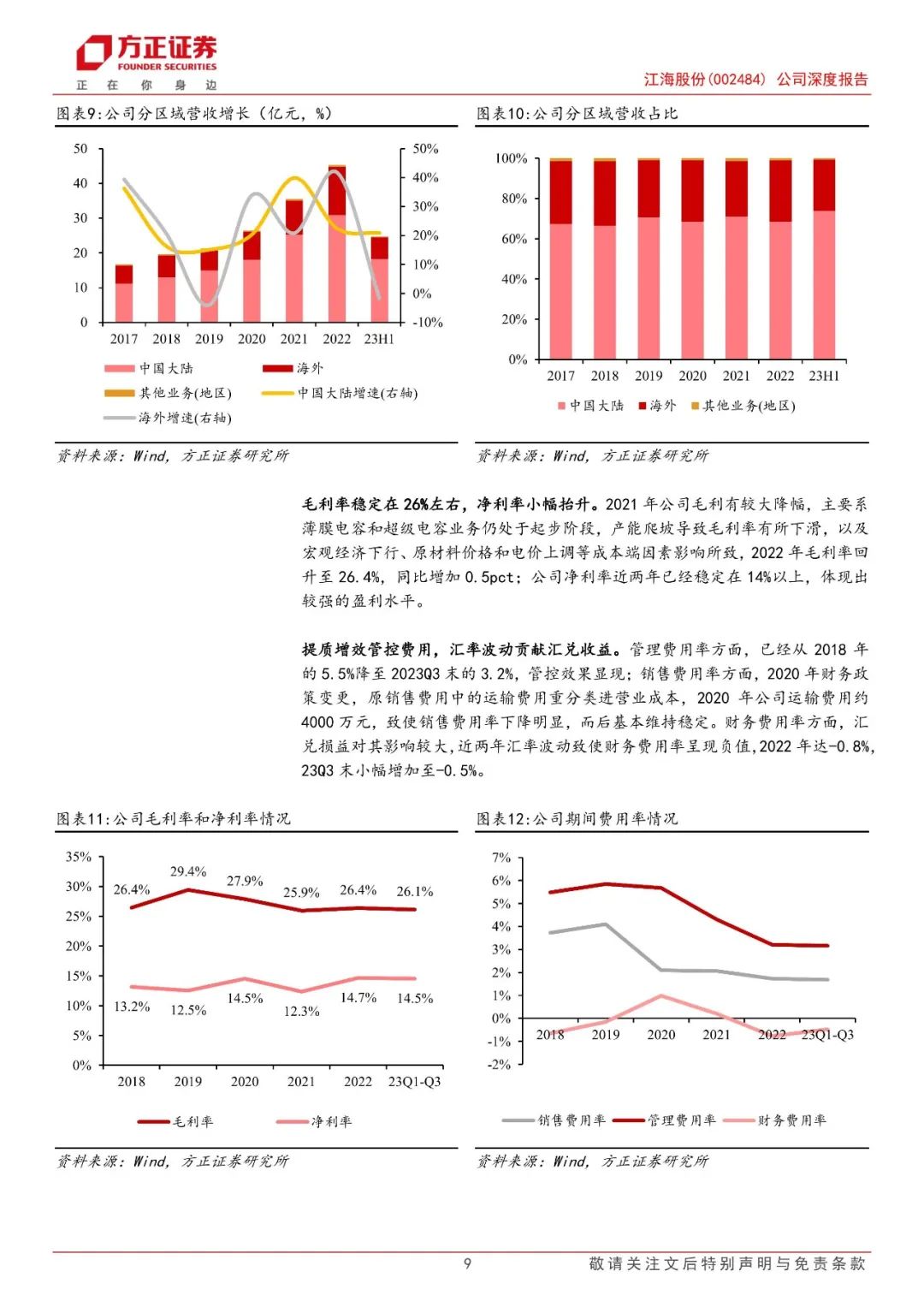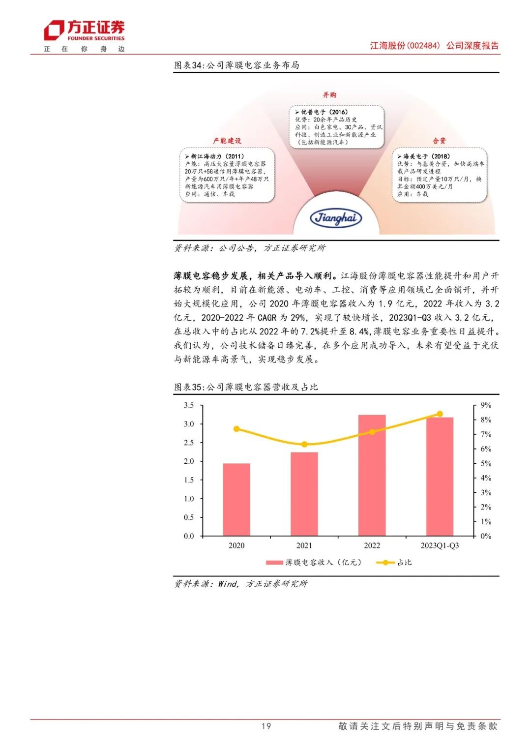 薄膜电容:技术积累日趋完善,新能源产品放量在即。薄膜电容凭借其高耐压、长寿命等特性,广泛应用于光伏、风电、电动汽车等领域。我们看到,2022年新能源汽车用DC-LINK薄膜电容出货量已经突破500万套,2023年国内薄膜电容市场规模有望达到300亿元,同比增长36%。公司2023Q1-Q3薄膜电容实现营收3.2亿元,占比8.4%,我们认为公司与基美的合作将进一步提升其在车用薄膜电容市场的份额。