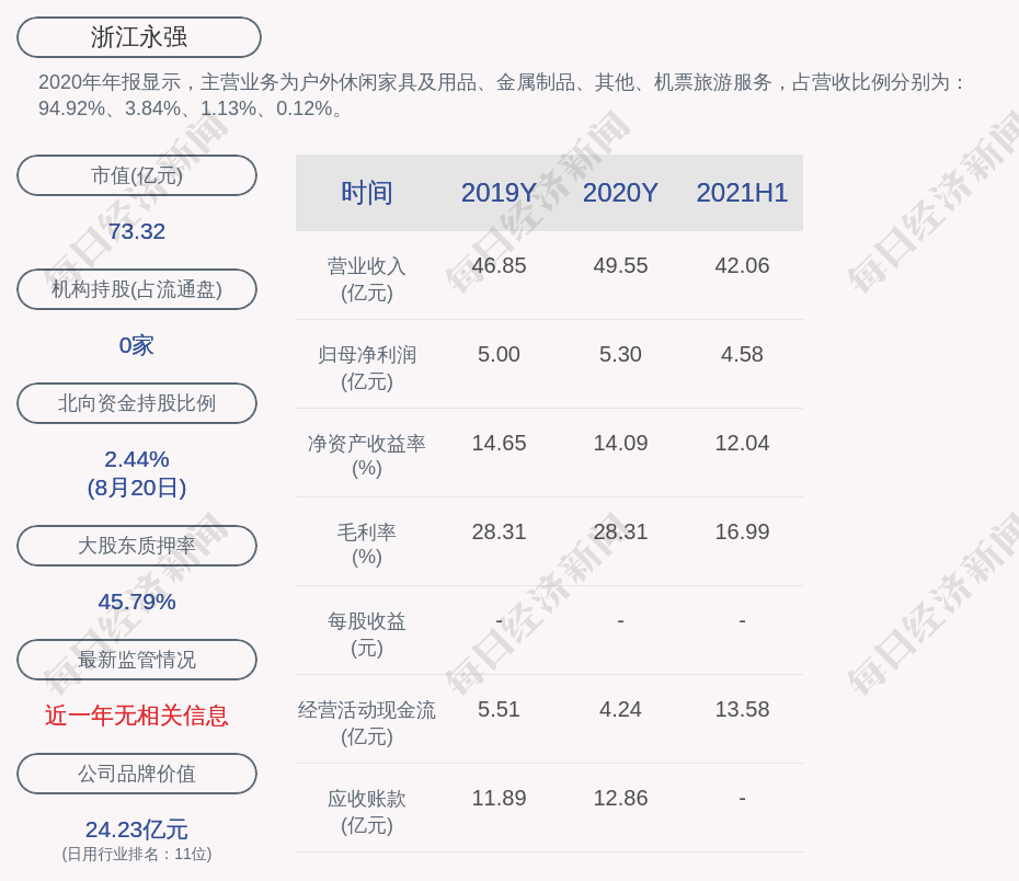 2020年年报显示,浙江永强的主营业务为户外休闲家具及用品、金属制品、其他、机票旅游服务,占营收比例分别为:94.92%、3.84%、1.13%、0.12%。