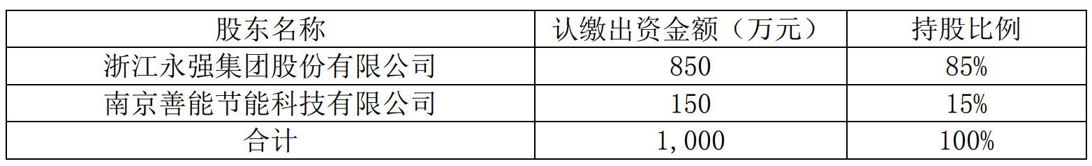 公告显示,浙江永强第六届董事会第三次会议审议通过了《关于审议对外投资的议案》,决定以公司自有资金850万元人民币与南京善能节能科技有限公司共同投资设立一家主要从事电动帐篷、智能阳光房系列产品业务的公司,并授权公司管理层办理该标的公司的投资设立事宜,包括但不限于办理后续出资、签署一切与本次对外投资相关的法律文件。