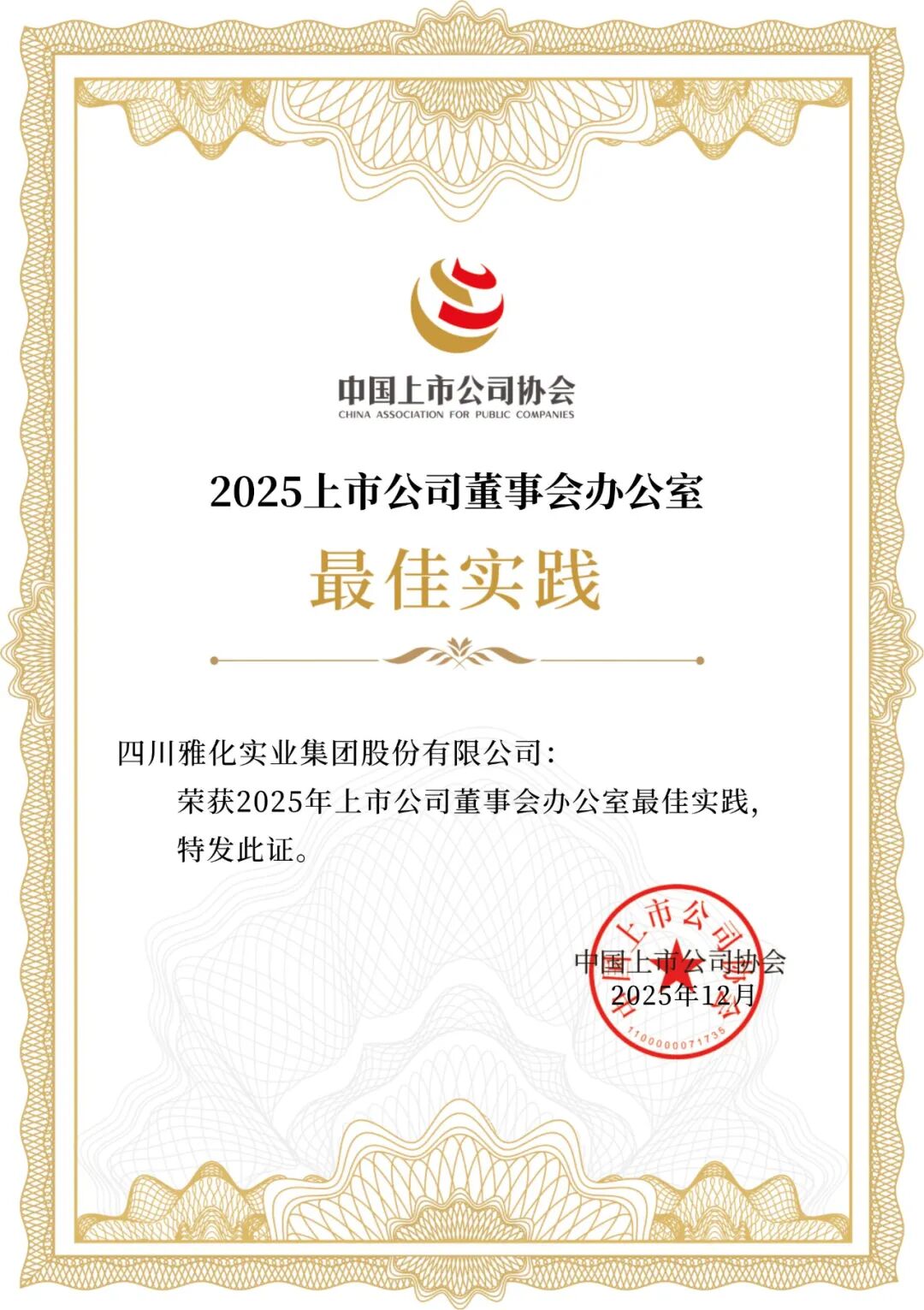 近日, 中国上市公司协会 正式公布“2025上市公司董办最佳实践案例”评选结果, 雅化集团 董事会办公室凭借在日常履职中的稳定表现与规范化运作,成功获评“2025年度上市公司董办最佳实践”,实现该荣誉连续三年获评。