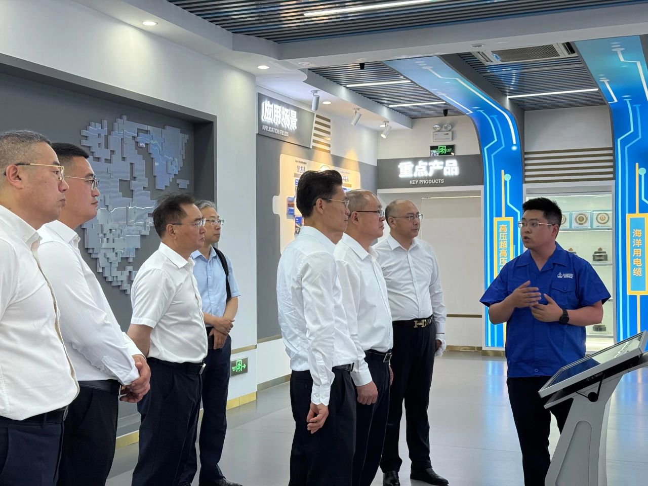 在企业展厅,赵东一行详细了解汉缆股份在发展历程、科技创新、产品研发等方面取得的成果,并对公司在线监测系统与电缆材料板块进行了重点考察,就相关技术应用与产业发展进行了深入交流。