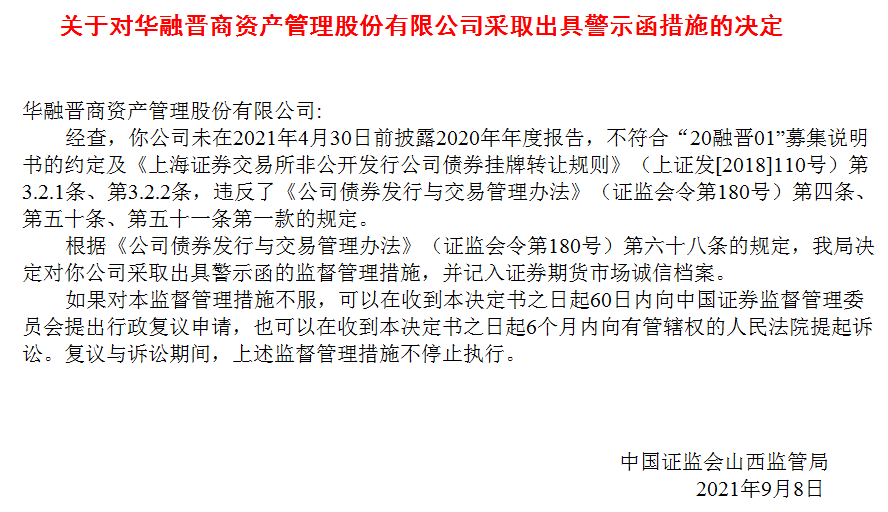 据监管函披露,华融晋商资产管理股份有限公司(简称:华融晋商)未在2021年4月30日前披露2020年年度报告,不符合“20融晋01”募集说明书的约定及上交所《非公开发行公司债券挂牌转让规则》(上证发[2018]110号)第3.2.1条、第3.2.2条,违反了《公司债券发行与交易管理办法》(证监会令第180号)第四条、第五十条、第五十一条第一款的规定。